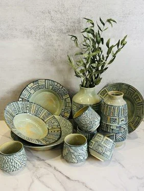 In Swanson’s kitchenware pottery, she finds inspiration in stories from customers such as a mother’s garlic keeper that conjures the warmth of home life. In addition to her functional kitchenware and New Orleans-centric pieces such as bead mugs, Swanson will also debut two new pottery lines as her “primary artistic expression” at Jazz Fest. In her first new pottery line, Whispering Gray, black mason stain is pressed into porcelain clay, producing different tones of gray on wheel-thrown vases. Using a traditional cut-out technique called the Devil’s Work or gui gong, she creates organic, intricate designs in this line of large porcelain vases and bowls. These are then glazed with “snowflake”, which produces a crackle effect when fired in the kiln. Swanson’s second line, Trace Path, features small vessels, bowls, and platters. Employing the centuries-old sgraffito technique, she carves wheel-thrown white clay through a layer of black slip that is finished with a teal “lagoon” glaze to amplify the carving.